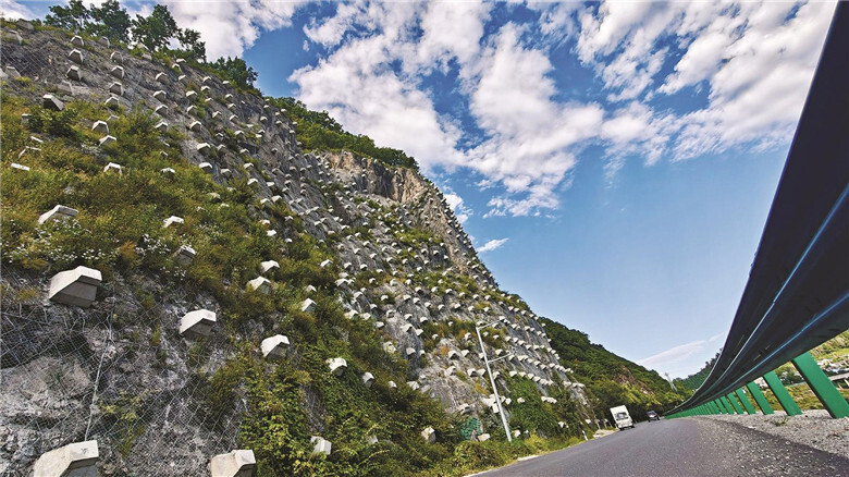 在G331项目吉林段224公里+750米处,锚索深化山体,防护网紧贴杰出山岩,保证路途通行安全。
